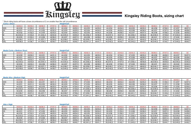 Kingsley beschikt over 28 hoogte en kuitcombinaties per laars. Ze hebben een bereik van 364 standaard maten. Wanneer uw maten overeenkomen met een tabelmaat kunt u bij bepaalde laarzen kiezen voor deze optie. Bij een tabelmaat is er een concrete kuit en hoogtemaat, de overige maatvoering is hierbij universeel en kan soms minder aansluiten dan een maatwerk laars. Deze maatvoering kan enkel toegepast worden op de basic leersoorten.